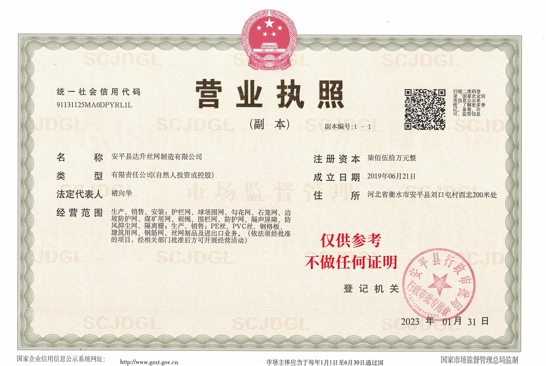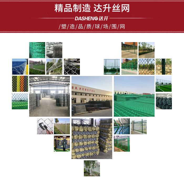 我公司主营丝网系列有勾花网菱形网、球场围网、刺绳滚笼、护栏网、防护网围栏等系列,主要产品有 镀锌勾花网、 PE/PVC包塑勾花网、勾花网护栏网、体育场球场围网、镀锌/包塑刺绳、锌钢护栏网、双边/框架护栏网、车间仓库隔离网、可移动式铁马护栏网等等产品。我们以高质量产品、完善的售后服务赢得了众多客户的认可。